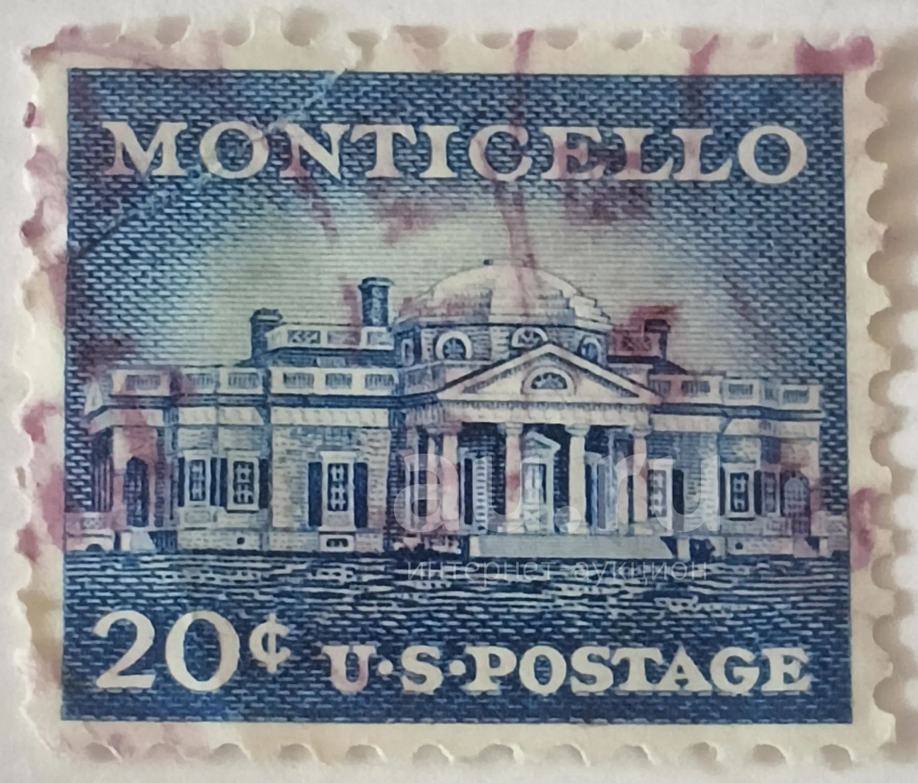 Марки_США, 20 центов 1956 г., Монтичелло (1772), Шарлоттсвилл, Вирджиния, гашёная;