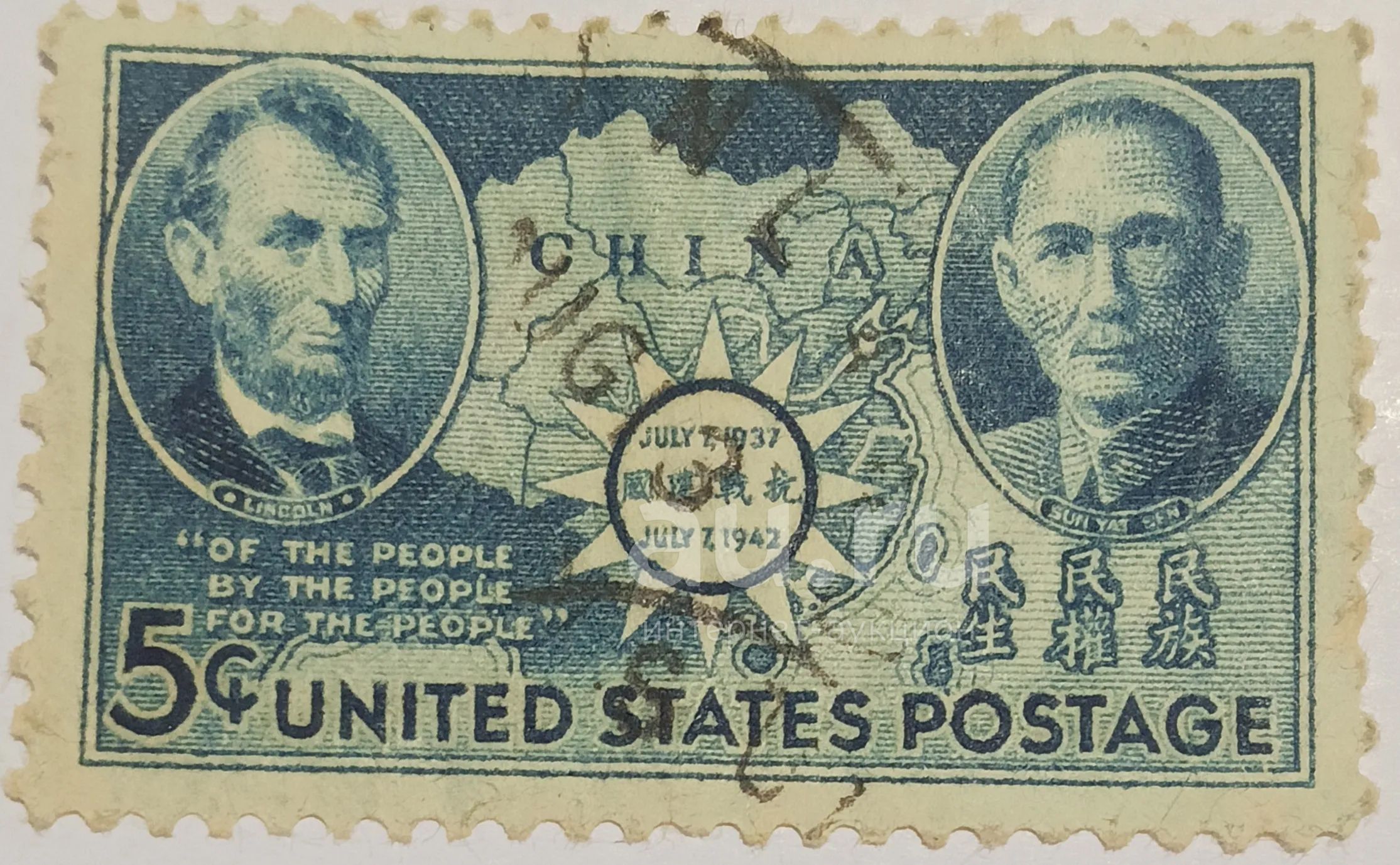 Марки_США, 5 центов 1942 г., Авраам Линкольн и Сунь Ятсен с картой Китая! Очень Редкая R!