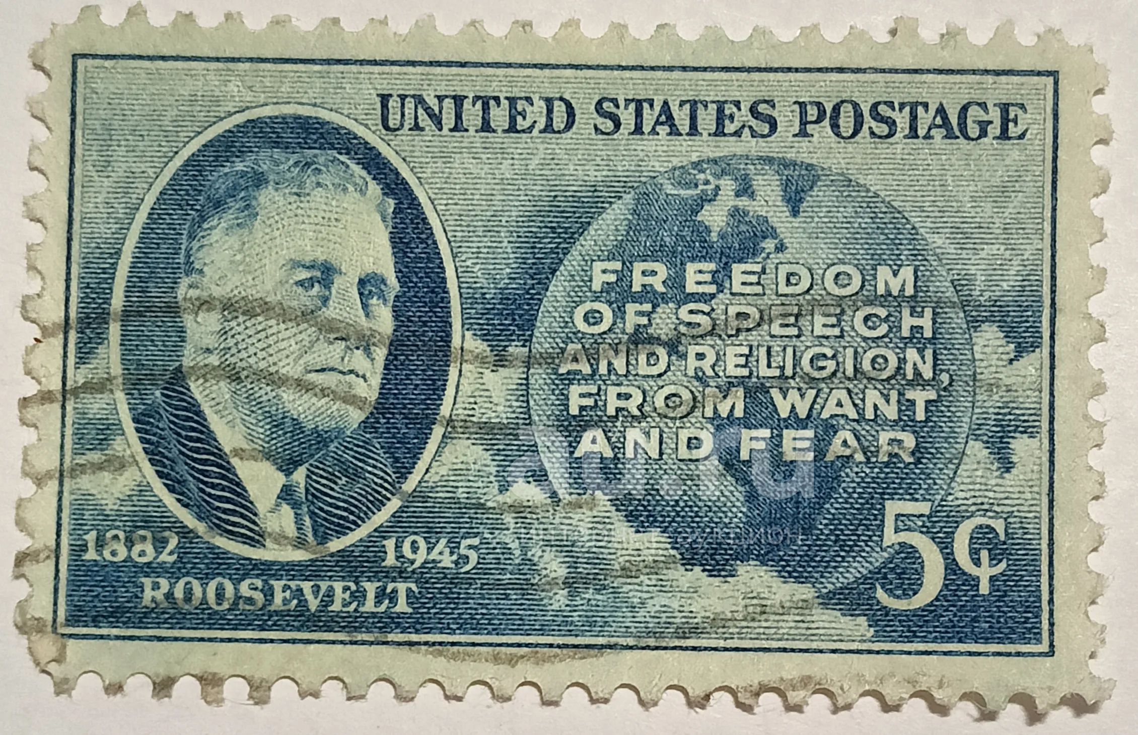 Марки_США, 5 центов 1946 г., Рузвельт, Карта Западного полушария и четыре свободы, Редкая!