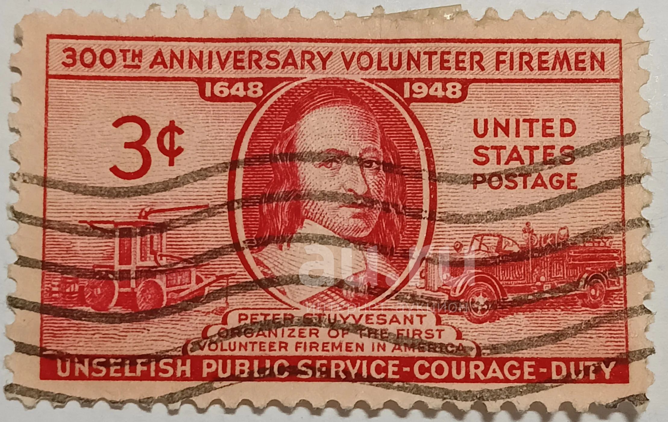 Марки_США, 3 цента 1948 г.Трехсотлетие добровольных пожарных, Питер Стайвесант (1610-1672), Нечастая!
