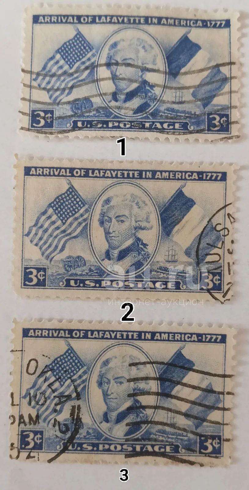 Марки_США, 3 цента 1952 г., 175-я годовщина прибытия Лафайета в Америку, Нечастая!