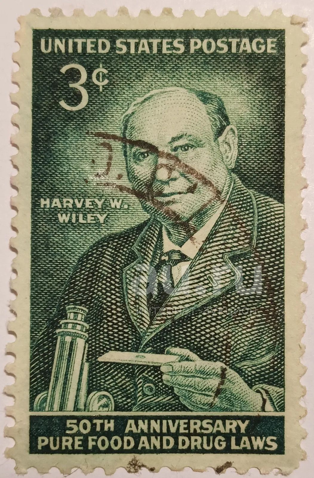 Марки_США, 3 цента 1956 г., 50-летие принятия законов о чистых продуктах питания и лекарствах, Гашеная