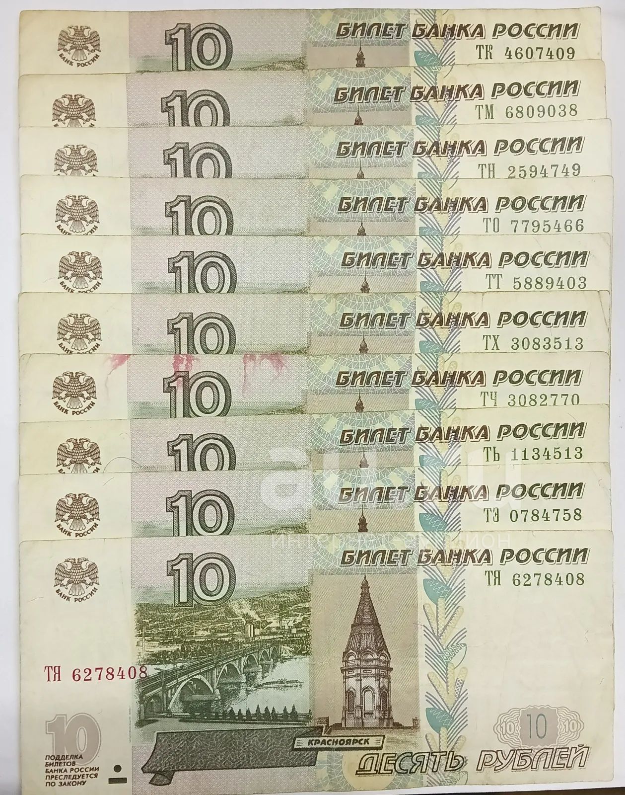 10 рублей 1997 год модификация 2004, Набор из 10 купюр серий: ТК, ТМ, ТН, ТО, ТТ, ТХ, ТЧ, ТЬ,ТЭ, ТЯ