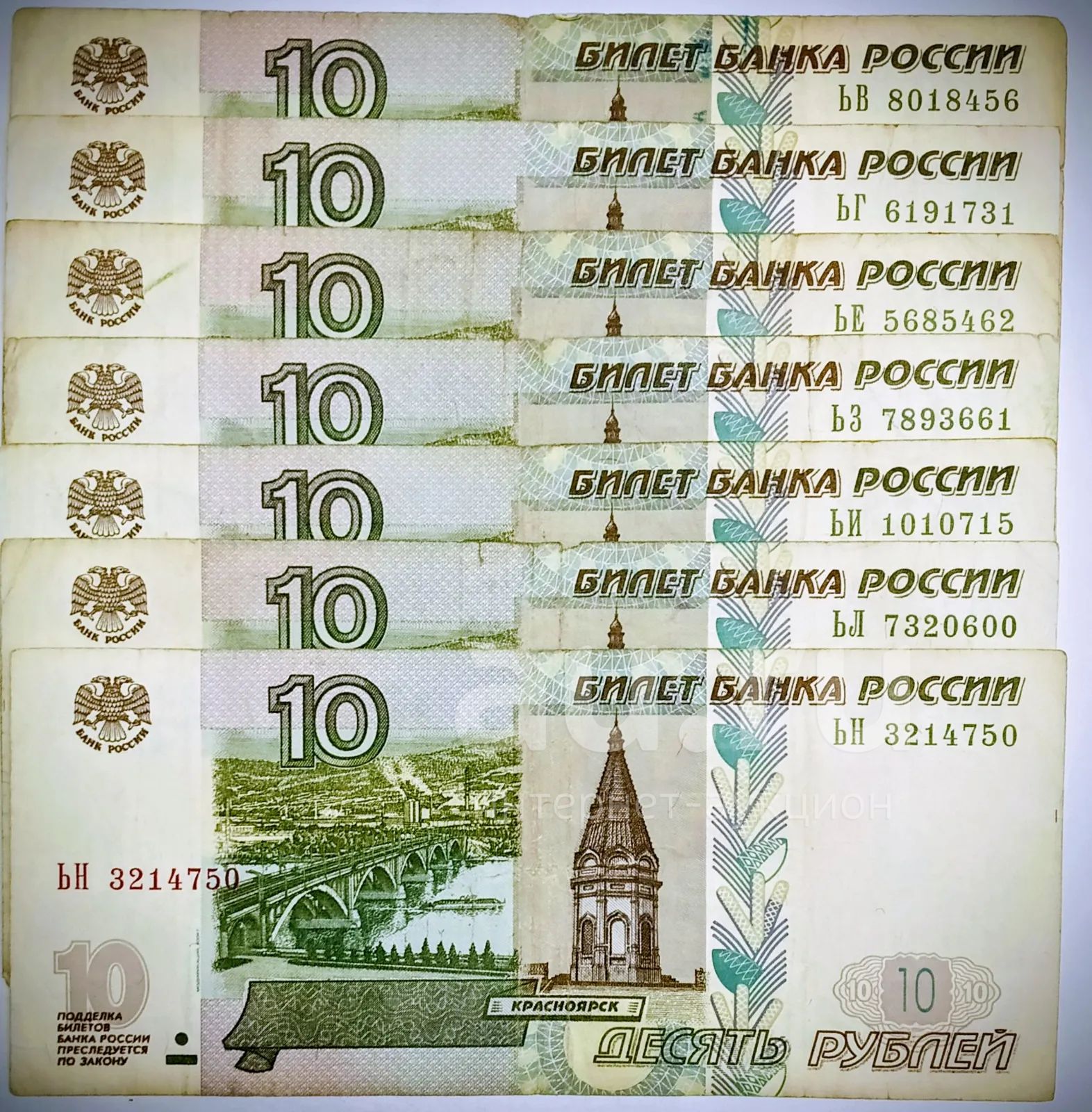 Вам предложен лот: Банкноты.10 рублей 1997 год модификация 2004, Набор из 7 купюр серий: ЬВ, ЬГ, ЬЕ, ЬЗ, ЬИ, ЬЛ, ЬН